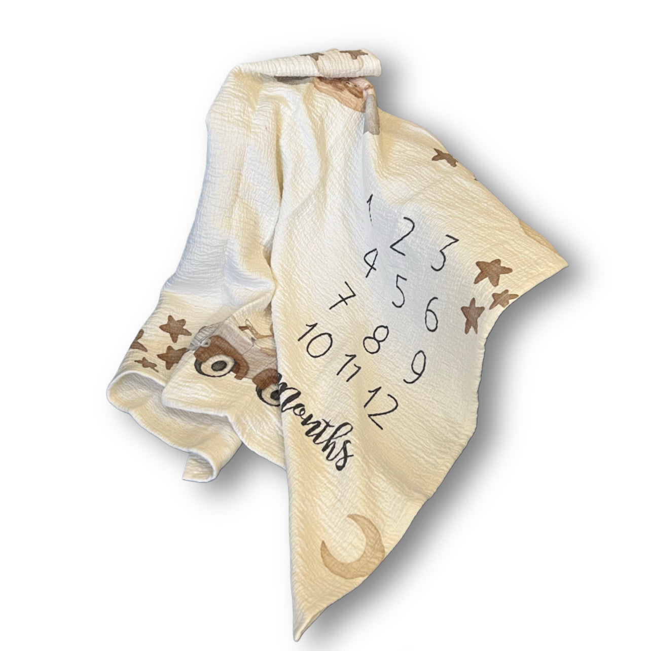 A milestone blanket is a thoughtful and personalized keepsake that celebrates a baby's growth and development during their first year and beyond. Here's a description of a typical milestone blanket: